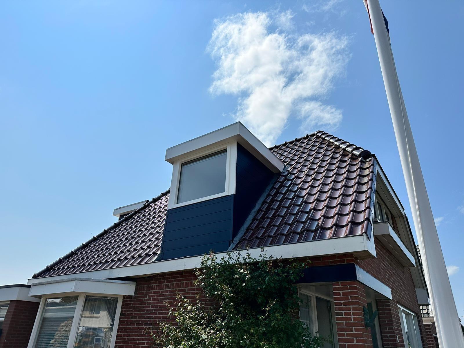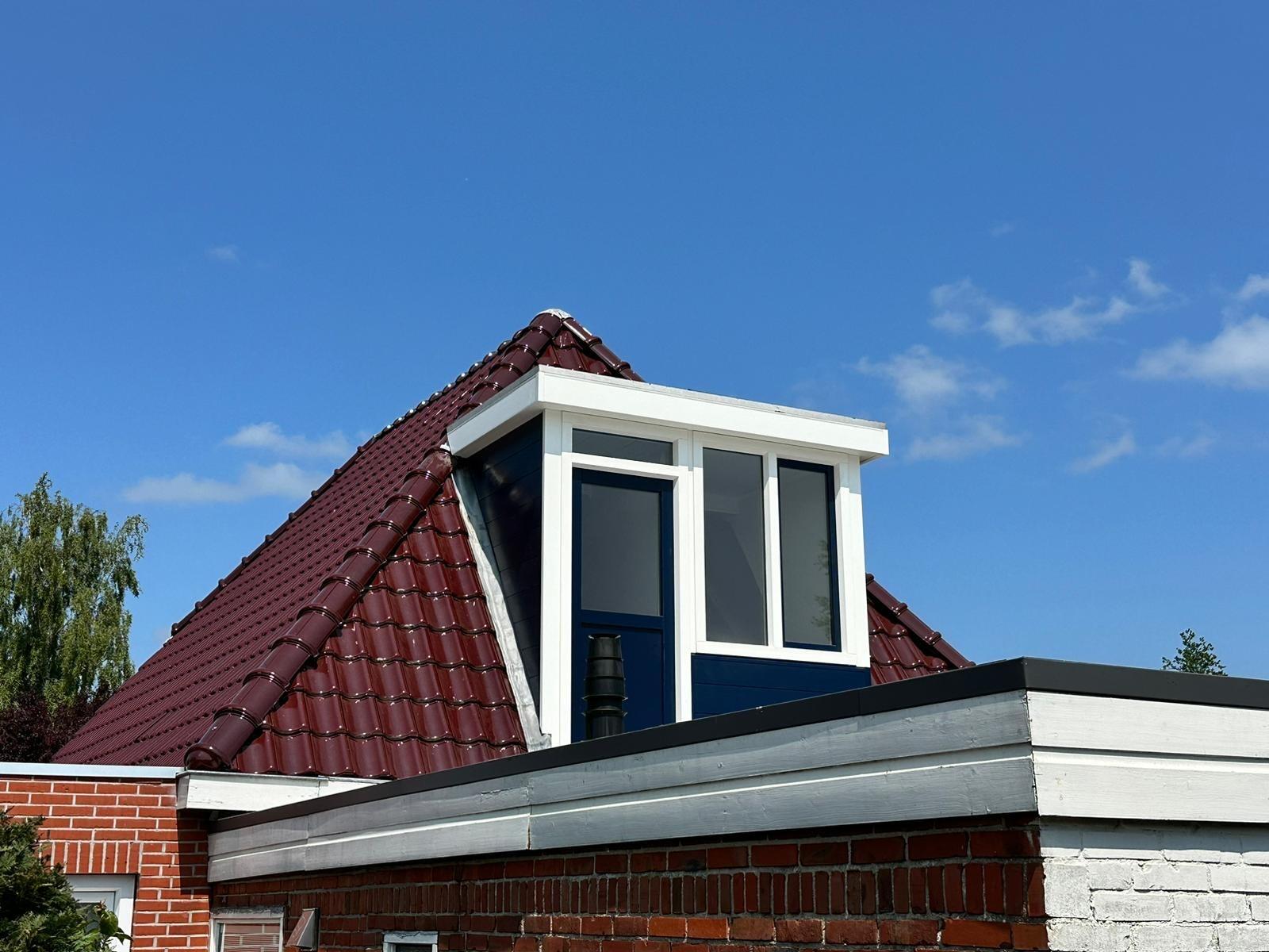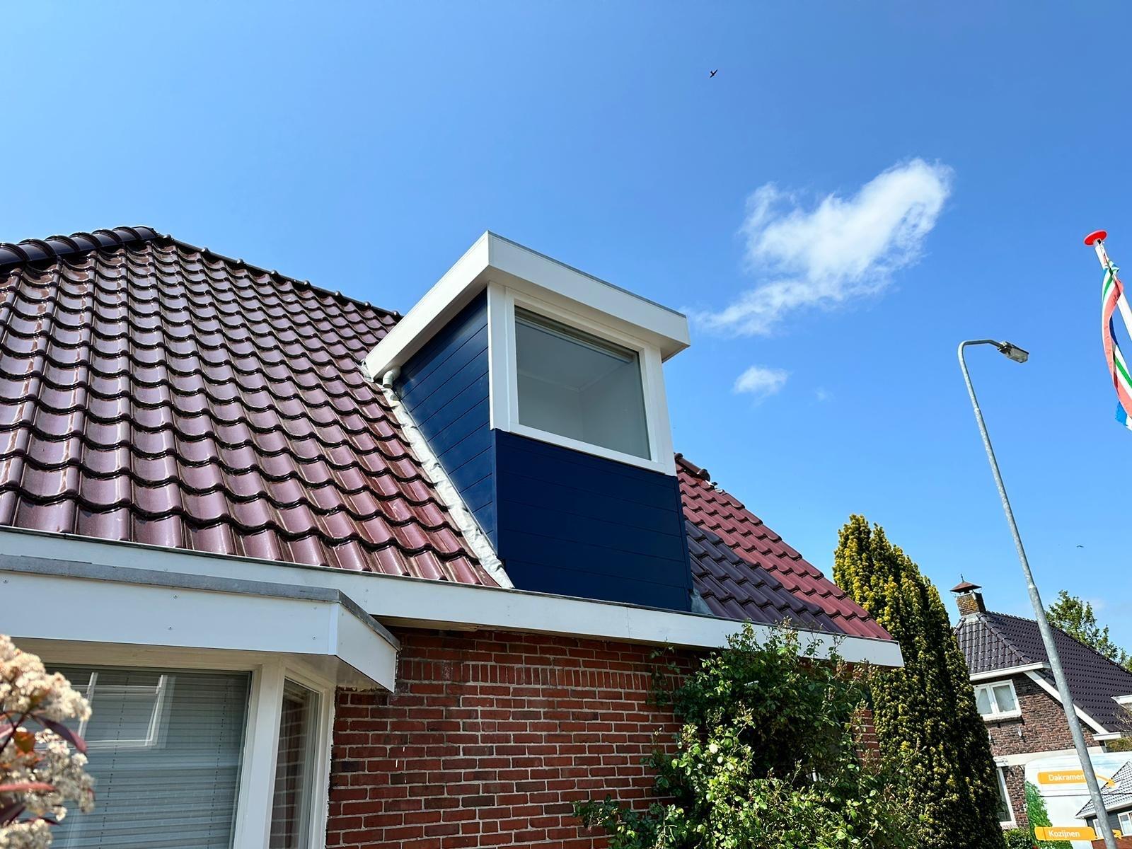 De zijwangen en voorzijde van de dakkapel zijn bekleed met Keralit sponningdeel 190 mm in de kleur Staalblauw RAL 5011. Keralit staat bekend om zijn duurzaamheid en kleurvastheid. Het materiaal is bestand tegen weersinvloeden en behoudt jarenlang zijn uitstraling zonder intensief onderhoud.